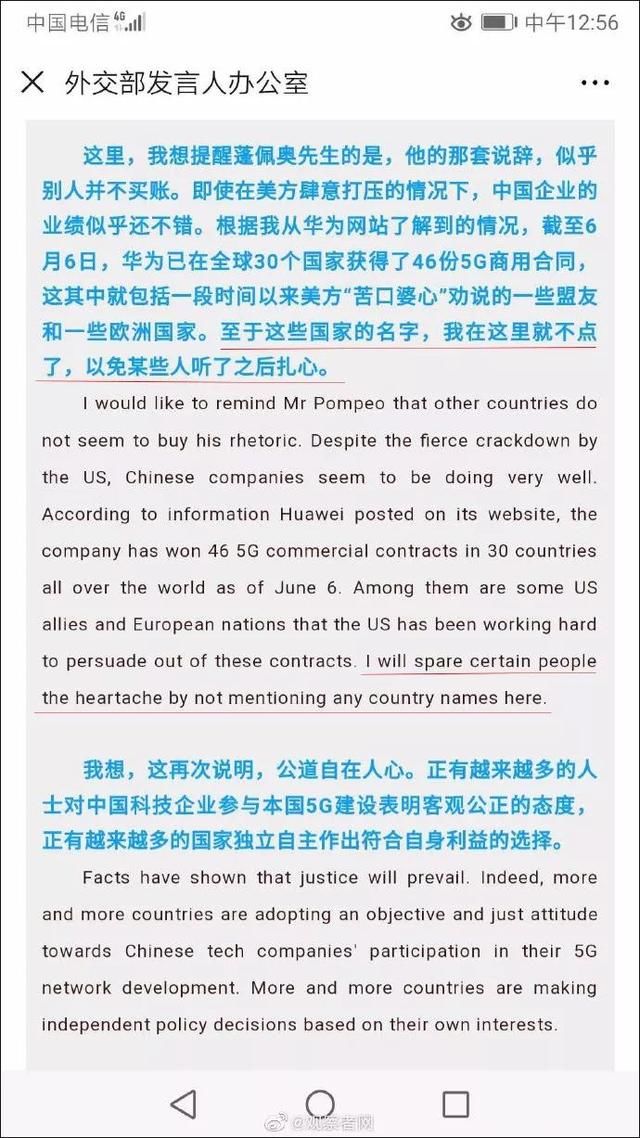在外交部例行記者會上,發(fā)言人耿爽在回應(yīng)關(guān)于“華為成績單”的問題時表示,截止到6月6日,華為公司已經(jīng)在全球30個國家獲得了46份5G商用合同,這其中就包括美方一段時間以來苦口婆心勸說的一些盟友和一些歐洲國家?!斑@些國家的名字這里我就不點了,以免某些人聽了之后扎心?!惫⑺f。